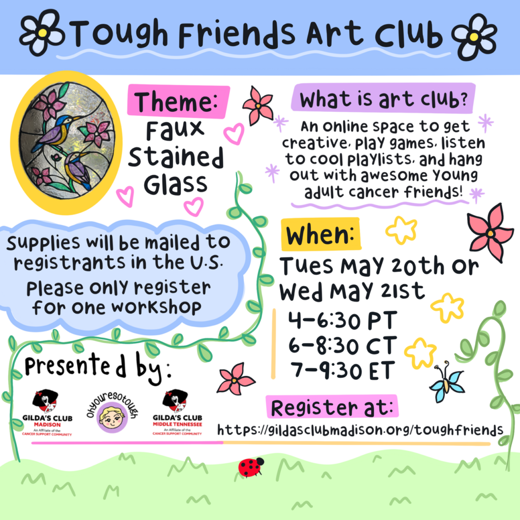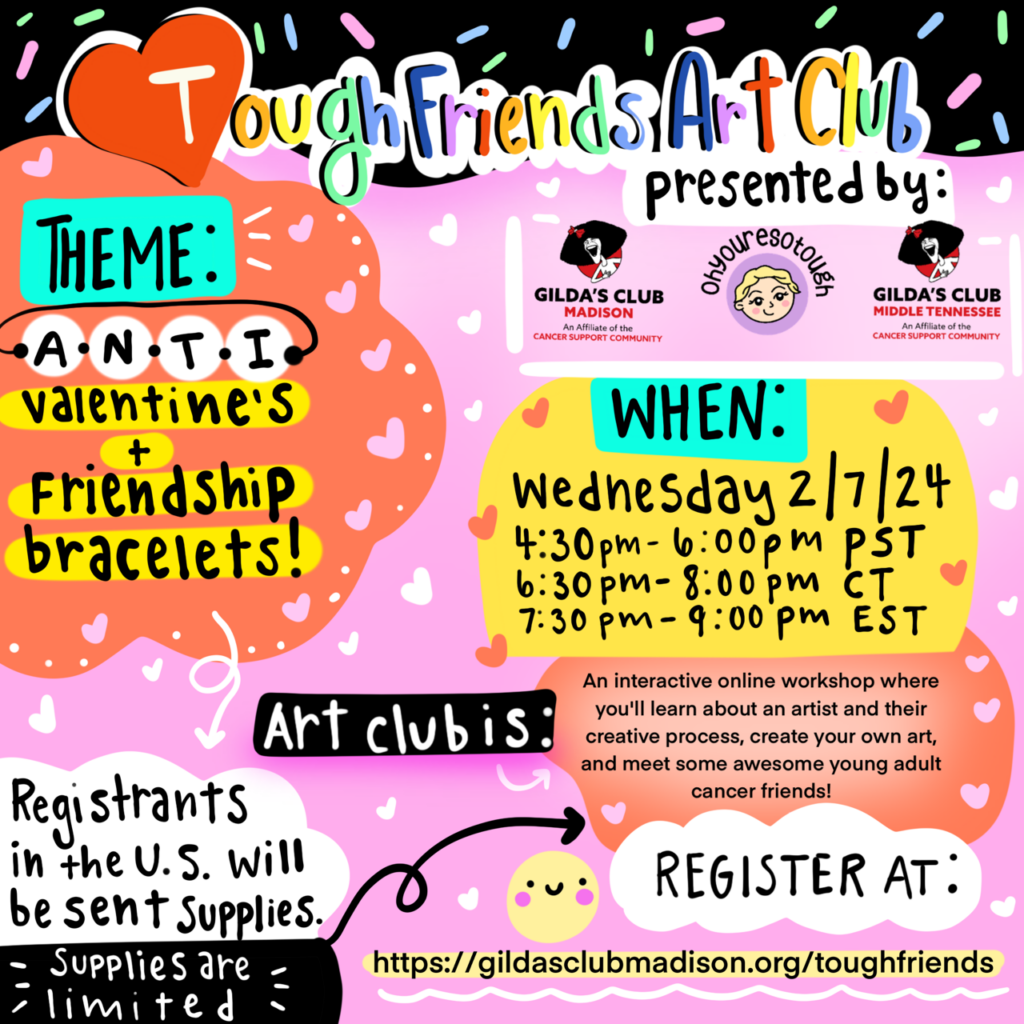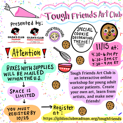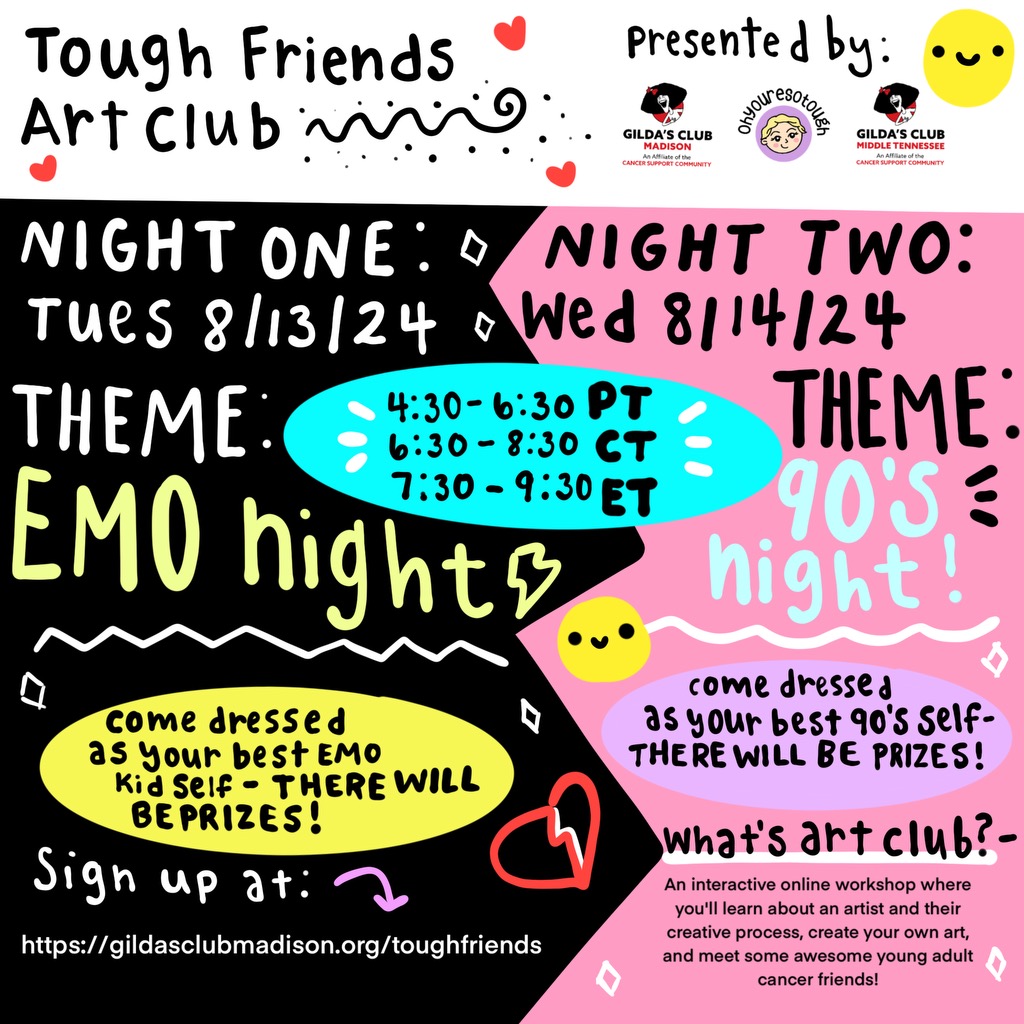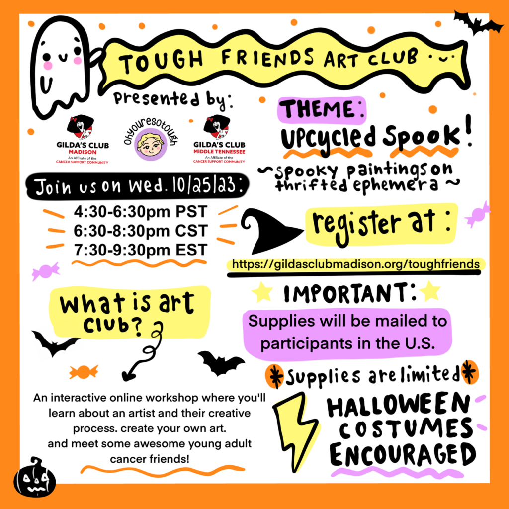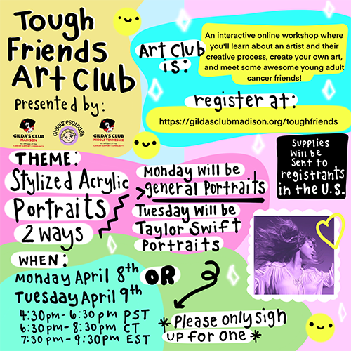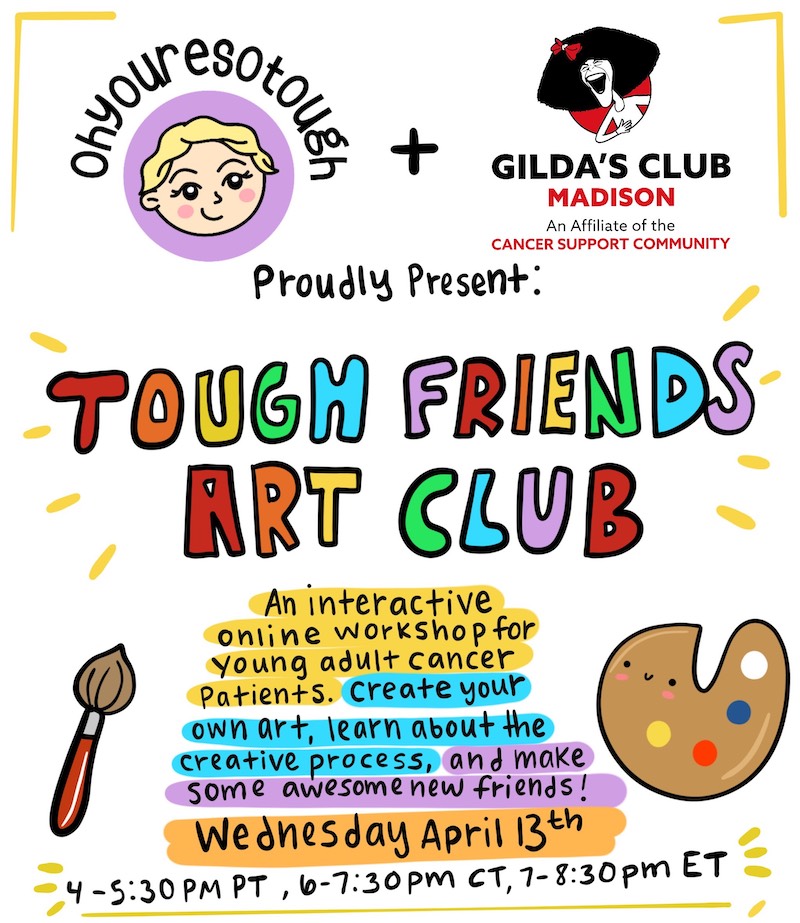 An interactive online workshop where you’ll learn about an artist and their creative process, create your own art, and meet some awesome young adult cancer friends. Plus there will be opportunities to win prizes!