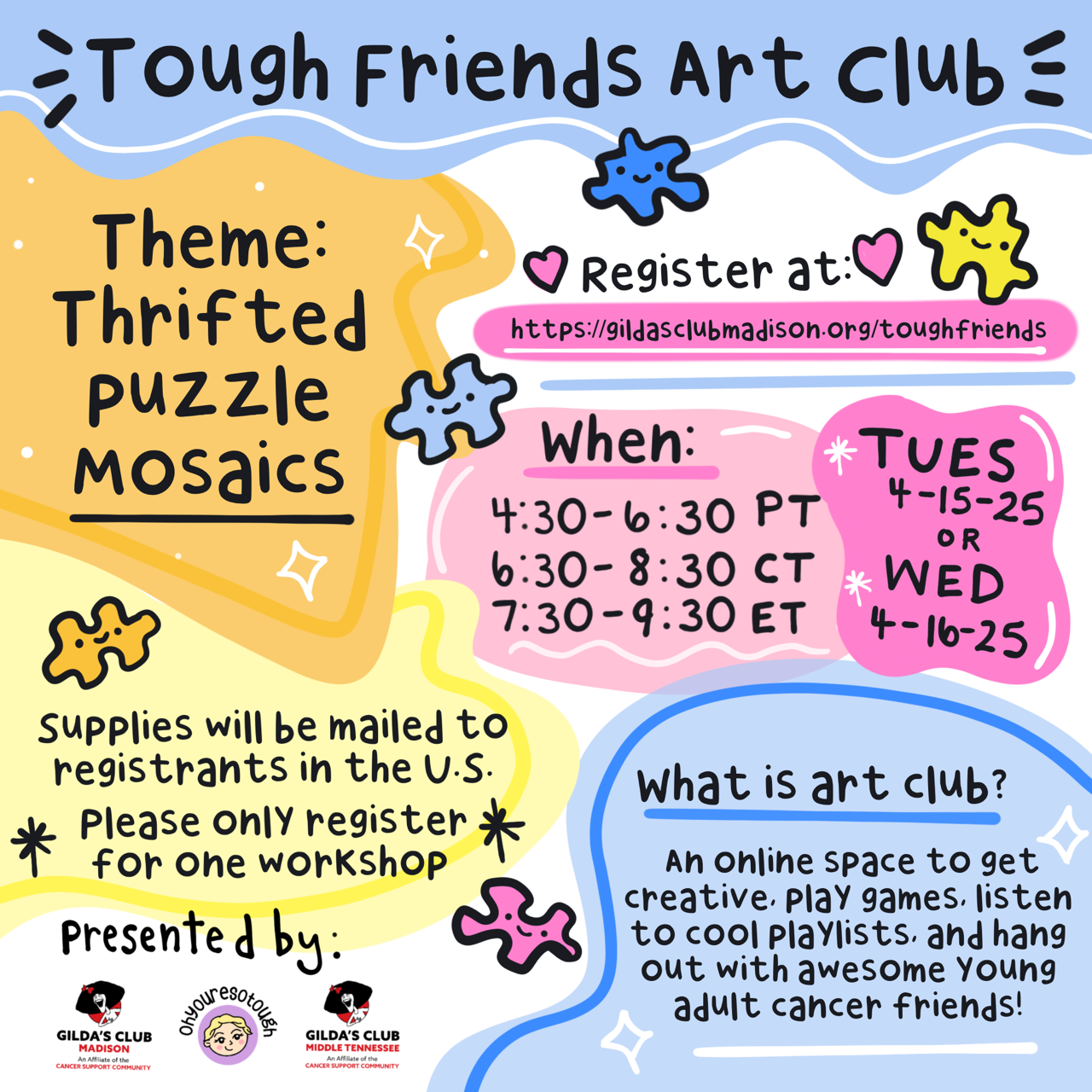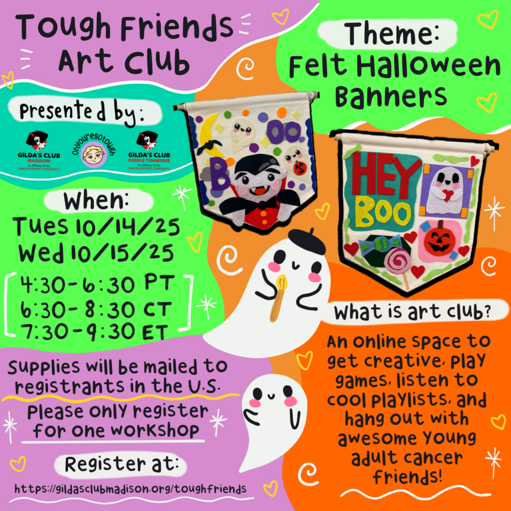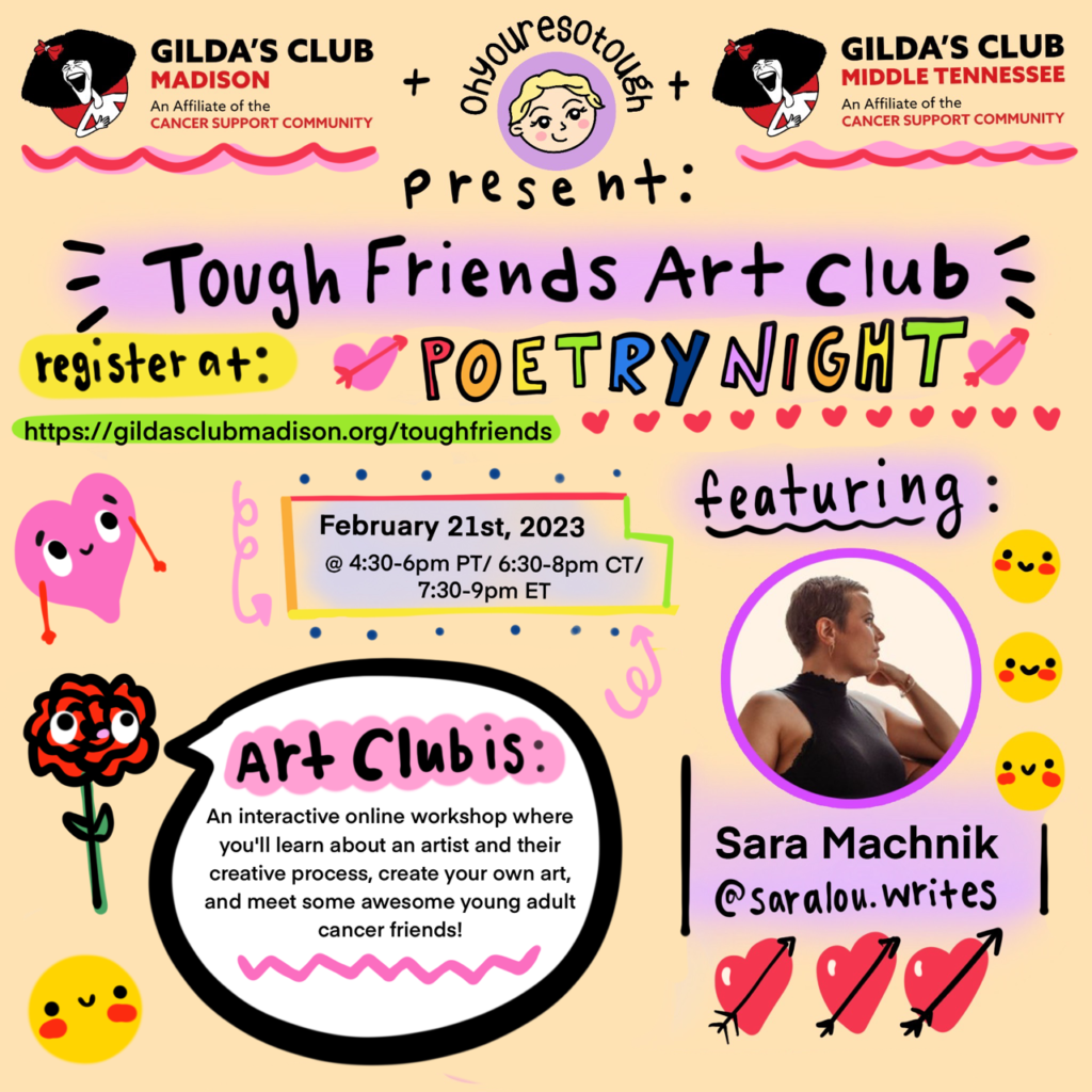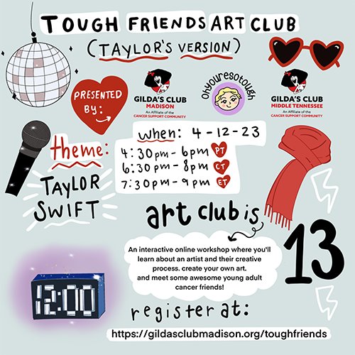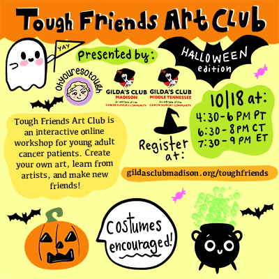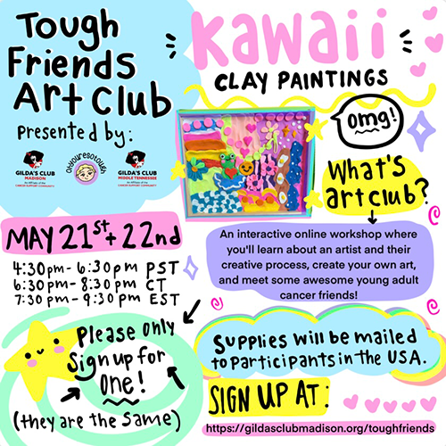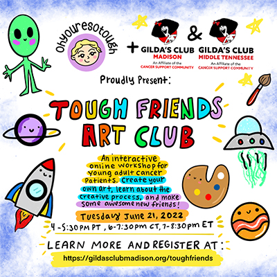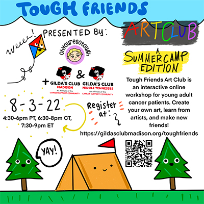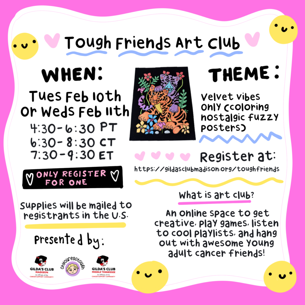 An interactive online workshop where you’ll learn about an artist and their creative process, create your own art, and meet some awesome young adult cancer friends. Plus there will be opportunities to win prizes!